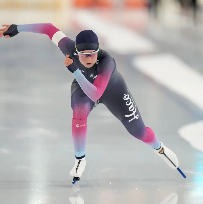 Als de junioren hun afstanden afgehaspeld hebben, verschijnt Dione Voskamp op het ijs van de schaatstempel. De sprintster van Team Novus zit midden in een zwaar trainingsblok, maar haar club Hardrijvereniging Den Haag-Westland kon ze niet in de steek laten. “Ik vind het leuk mijn club te supporteren”, zegt Voskamp. “Mijn moeder traint de junioren. Als ze vragen iets te doen, dan is de keuze snel gemaakt. En al helemaal omdat ik mijn afstand mocht kiezen, de 500 meter.”