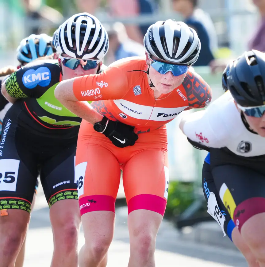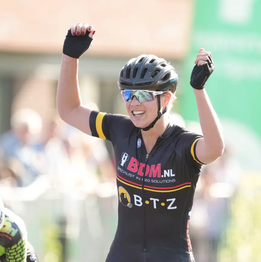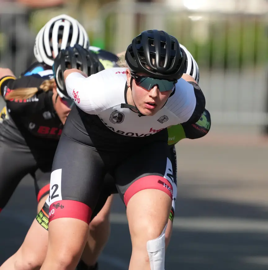 Lotte Veenstra is kort na de finish even ontroostbaar. Met een bebloede knie en een kin waar de kaasschaaf overheen is gegaan, gaat ze op de stoep zitten naast de teamgenotes van A6.nl. Terwijl ze op luide stem haar versie van de crash geeft, druppelen de tranen van teleurstelling over haar wangen. Het duurt niet lang: de lach keert terug en bij nader inzien is ze toch ook trots op de dappere poging om na de val alleen door te knokken om de derde plaats te grijpen. Dat is mislukt. In de slotronde ‘vreet’ het peloton Veenstra alsnog op en wordt ze achtergelaten om alleen en als zeventiende aan de streep te arriveren.
