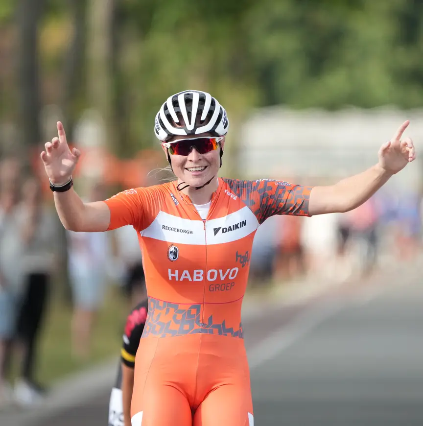 Ze glimt van oor tot oor, nog nahijgend van de vrouwenwedstrijd waarin ze het de ongenaakbare Marijke Groenewoud voor eigen volk in elk geval knap lastig heeft weten te maken. Sanne Oosterwijk is de rapste geweest in de pelotonsspurt en staat als nummer drie op het ereschavot. Van Maaren: “Ik wist onderweg ook al dat ik in een sprintje met Marijke niet zou kunnen winnen. Ik heb ervoor gereden en verloren. Het is niet anders. Gelukkig dat we die Belgische (Fran Vanhoutte, red.) er voor de finale nog af konden rijden. Die weigerde een meter op kop te rijden. Dadelijk klopt ze me nog voor de tweede plek, dacht ik op een gegeven moment. Dat hebben Marijke en ik kunnen voorkomen.”