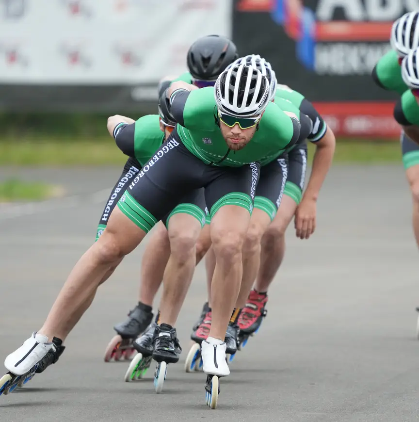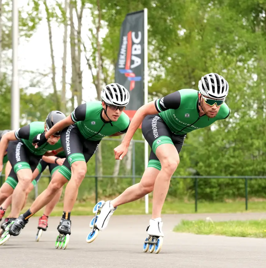 Wat je deze dinsdagmorgen ziet op de skeelerbaan van Oost Veluwe, wijkt nauwelijks af van de gebruikelijke taferelen die zich op elke ijsbaan voordoen als de grote teams hun werk verrichten. Zoevende skatewielen op asfalt vervangen het geluid van het gekras en getik dat de ijzers van schaatsen veroorzaken bij elke slag op het ijs. In twee, soms drie groepen rijden de atleten hun rondjes, bij elke passage van de finish krijgen ze de tijd toegeschreeuwd door de trainer.