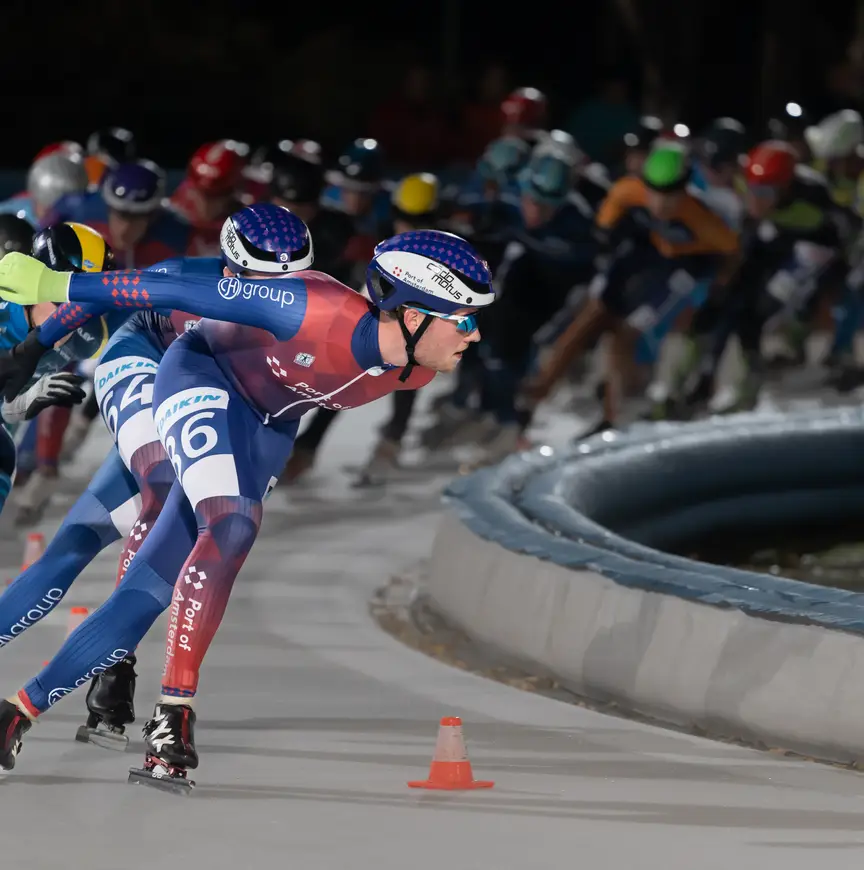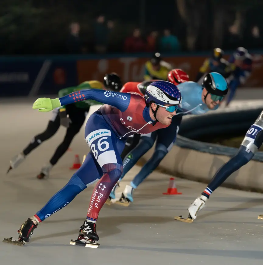 Waar een groot deel van het marathonpeloton de voorbije week via social media graag liet weten op welke plek onder de (vooral) Spaanse zon de batterij werd opgeladen, reden de studenten van Port of Amsterdam gewoon rondjes op hun vertrouwde Jaap Edenbaan. “Casper (Helling, red.) vond het niet nodig dat we helemaal van het ijs wegbleven omdat er een weekend geen wedstrijd was gepland. Lekker doordeweeks doorgaan met schaatsen, dan kun je aan je techniek schaven. In het weekend moest iedereen fietsen. Kilometers maken om de conditie op peil te houden. Nou ja, op mij na dan”, klinkt het bijna verontschuldigend uit de mond van de 23-jarige Amsterdammer Pijke Steenhuis.