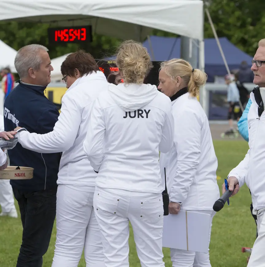 Als de race eenmaal van start is, is het de taak aan de juryleden die langs het parcours staan. "De bochtencommissarissen noemen we dat ook wel", zegt Mulder. "Die mensen kijken hoe alles loopt. Op de baan gaat dit om het overschrijden van de lijn en dat je niet afwijkt van je baan. Kortom: Dat er fair wordt geskeelerd", zegt hij. "Op de weg geldt hetzelfde, alleen ligt daar geen lijn in de bocht." Als een van de rijders een overtreding begaat wordt dat via een oortje direct gecommuniceerd naar de jurywagen waar ze zich over de bevindingen zullen buigen.