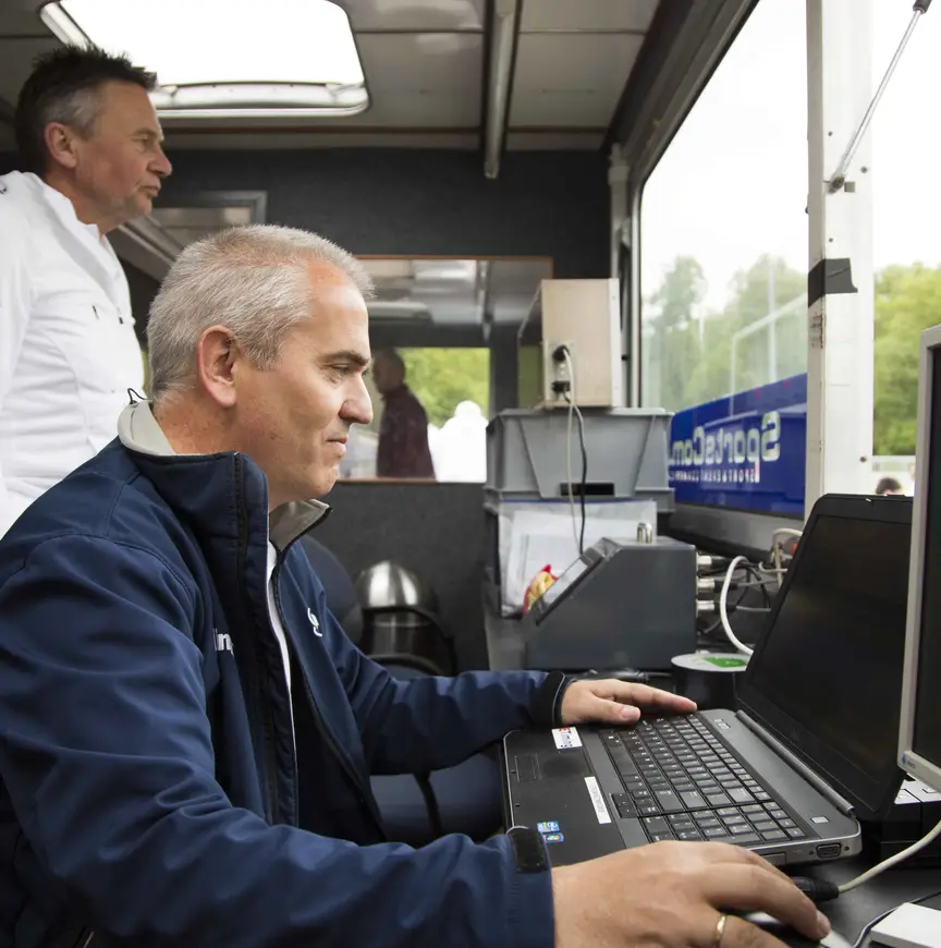 In en om die wagen bevindt zich een groot deel van het juryteam: De man achter het transpondersysteem verzorgt daar de tijdwaarneming. Een ander jurylid neemt het rondebord en de bel voor zijn/haar rekening. Weer een ander bedient de video en de speaker roept vanuit daar om wat hij van de jury doorkrijgt. "Maar hij houdt ook wel van zijn eigen verhaaltjes hoor", lacht Mulder.