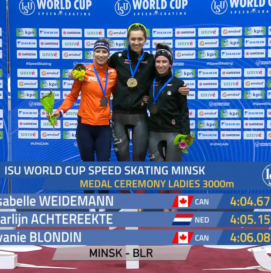 Isabelle Weidemann boekte op de 3 kilometer haar tweede wereldbekerzege uit haar loopbaan. De Canadese stayer snelde op het ijs van de Minsk Arena naar een tijd van 4.04,67 en dat was de tweede tijd ooit gereden in deze hal. Alleen Martina Sablikova was ooit een keer sneller, maar vrijdagavond kwam de Tsjechische niet in de buurt van de winst (Sablikova werd vierde). Carlijn Achtereekte werd in een tijd van 4.05,15 tweede en pakte daarmee haar derde individuele World Cup-medaille.