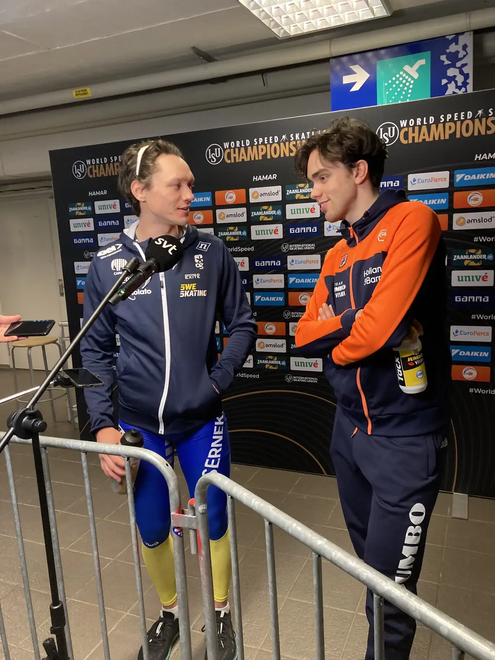 Mooi onderonsje in de catacomben van het Noorse ijsstadion. Terwijl de enthousiaste Noren nog een keer de kelen schrapen om hun landgenoten (inderdaad) naar de wereldtitel op de teamsprint te schreeuwen, verschijnen Nils van der Poel en Patrick Roest voor de camera van een Zweeds tv-station. De winnaar van de vijf kilometer wordt gevraagd hoeveel seconden voorsprong zijn Nederlandse tegenstrever moet hebben voor de tien kilometer van zondagmiddag. "Met twintig seconden kan hij het redden, denk ik", antwoordt Van der Poel met een stevige grijns op zijn gezicht. "Maar dan moet hij de race van zijn leven rijden en ik gewoon een goede wedstrijd. In dat geval is er nog een kans voor Patrick. Is het negentien seconden, dan kan hij het vergeten."