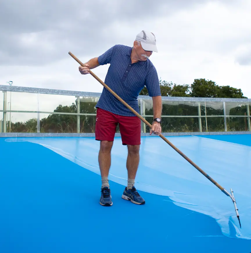 Een stad met internationale allure, daar wilden de Italianen zich graag aan verbinden. Tijdens het jongste EK Inlineskaten werden de laatste gesprekken gevoerd en kon Rotterdam op de planning gezet worden. Nu worden emmers van blauwe verf uitgesmeerd. “Om een ronde in de coating te zetten, lopen we zo’n duizend keer van boven naar beneden over de baan”, legt de Italiaan uit. Hij zorgt ervoor dat de emmers gevuld blijven met verf, zijn collega loopt heen en weer met de trekker. Diverse betrokken vrijwilligers offeren deze week hun vrije tijd op om de verf aan te brengen op de baan.