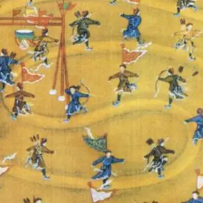 In de tijd dat de rolschilderingen werden gemaakt, regeerde keizer Qianlong (1736-1795) over China en was militair vertoon geworden tot puur hofvermaak, niet zelden in de vorm van festiviteiten. Op de schildering is een houten poort te zien, die op het ijs is geplaatst.
