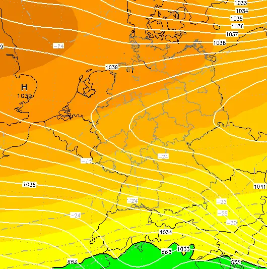 Het hogedrukgebied positioneert zich richting het weekend weer wat nadrukkelijker boven Oost-Europa terwijl we de luchtdruk zien dalen ten westen van Frankrijk en Engeland. Deze wisselwerking zorgt ervoor dat de wind met een duidelijke zuidcomponent wat toeneemt en koude vastelandslucht uit Frankrijk meeneemt. Frankrijk is immers deels nog met sneeuw bedekt en zelfs een zuidenwind levert dan kou op.