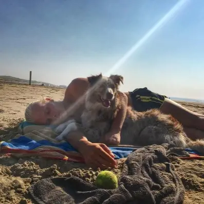 Koen Verweij verscheen twee weken geleden voor het eerst op het ijs voor een trainingsrace en sloot die als snelste af. De Noord-Hollander genoot vervolgens van een dagje strand met zijn hond. (Bron: Instagram)