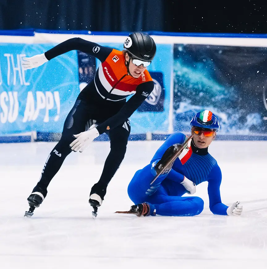 Al was het een wonder dat Jens van 't Wout bleef staan op de mixed relay na een klap op zijn neus van de Italiaan Pietro Sighel, die vervolgens net ontweken werd door de Nederlander.