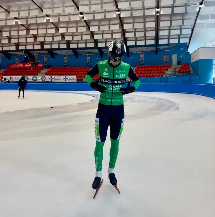 Maar wat voor pak heeft Jenning daar aan? De langebaanschaatser van Reggeborgh keerde even terug naar zijn geliefde shorttrackbaan en gebruikte daarvoor het snijvaste pak van zijn marathoncollega's.