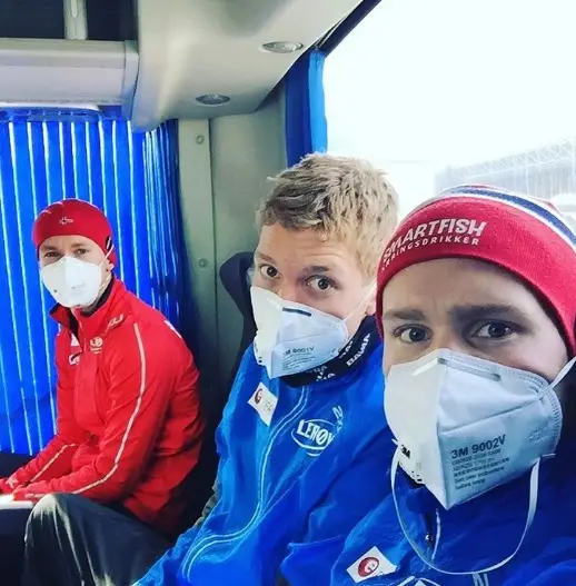 Ook de Noorse schaatsers – waaronder Sverre Lunde Pedersen – zijn inmiddels in Harbin en laten, gezien de mondkapjes ter bescherming tegen de luchtvervuiling, niets aan het toeval over. (Bron: Instagram)