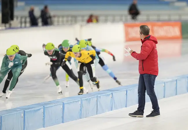 Als veertiger is Zwitser immers een relatief jonge kracht onder de scheidsrechters. Toen de telg uit een echt schaatsgezin, broers Ralf en Jens waren verdienstelijke marathonschaatsers, door blessures noodgedwongen moest stoppen met schaatsen, hielp hij een avondje in de tijdwaarneming op zijn thuisbaan in Breda. “Van het een kwam het ander en ik rolde door naar de functie van gewestelijk scheidsrechter. Daarna kwam de opleiding voor nationaal scheidsrechter en nu sta ik ook bij de ISU op de lijst.” Nog voor corona uitbrak mocht Zwitser met de Junior World Cup in Minsk zijn eerste grote buitenlandse wedstrijd leiden.