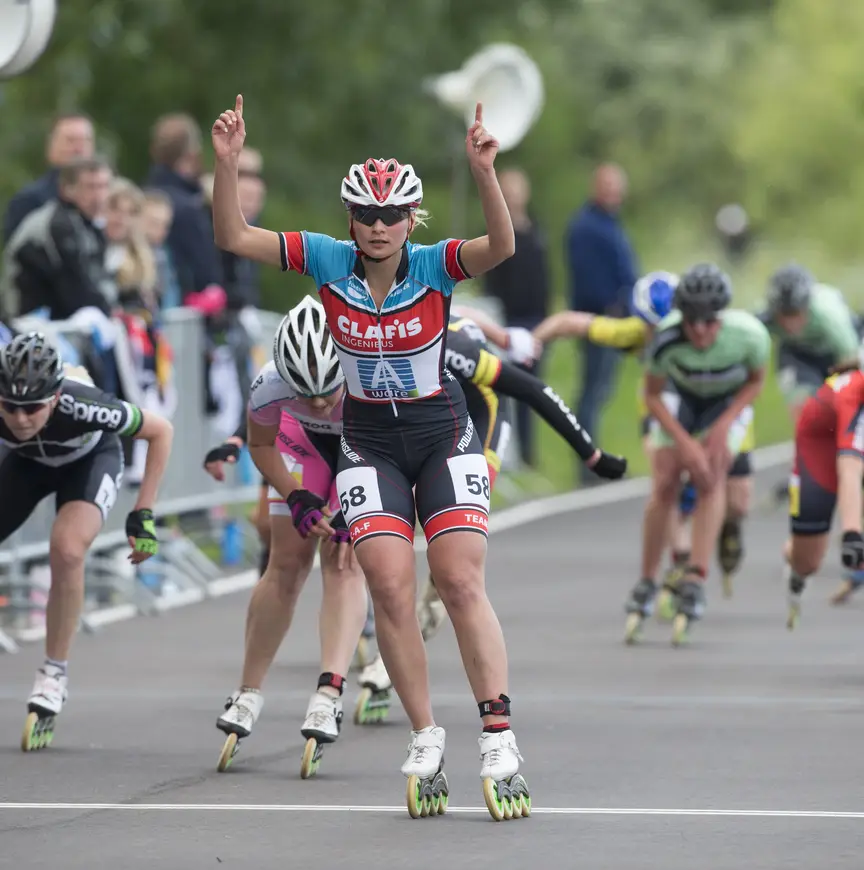 In 2013 werd Irene Schouten in Almere nog min of meer per ongeluk Europees kampioen op de 10 km punten/afvalkoers, doordat ze vroeg wegreed en het peloton te lang aarzelde. Maar inmiddels heeft ze ook op de skates haar sporen verdiend. Ze won in april de eerste wegmarathon in Oldebroek en werd derde in Steenwijk. “We trainen met de ploeg veel op de skeelers. Ik heb dit jaar al meer geskeelerd dan vorig jaar in het hele seizoen.”