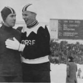 De Noor Knut Johannesen complimenteert Shilykovsky met zijn winnende 5000 meter op het WK allround 1958 in Helsinki.