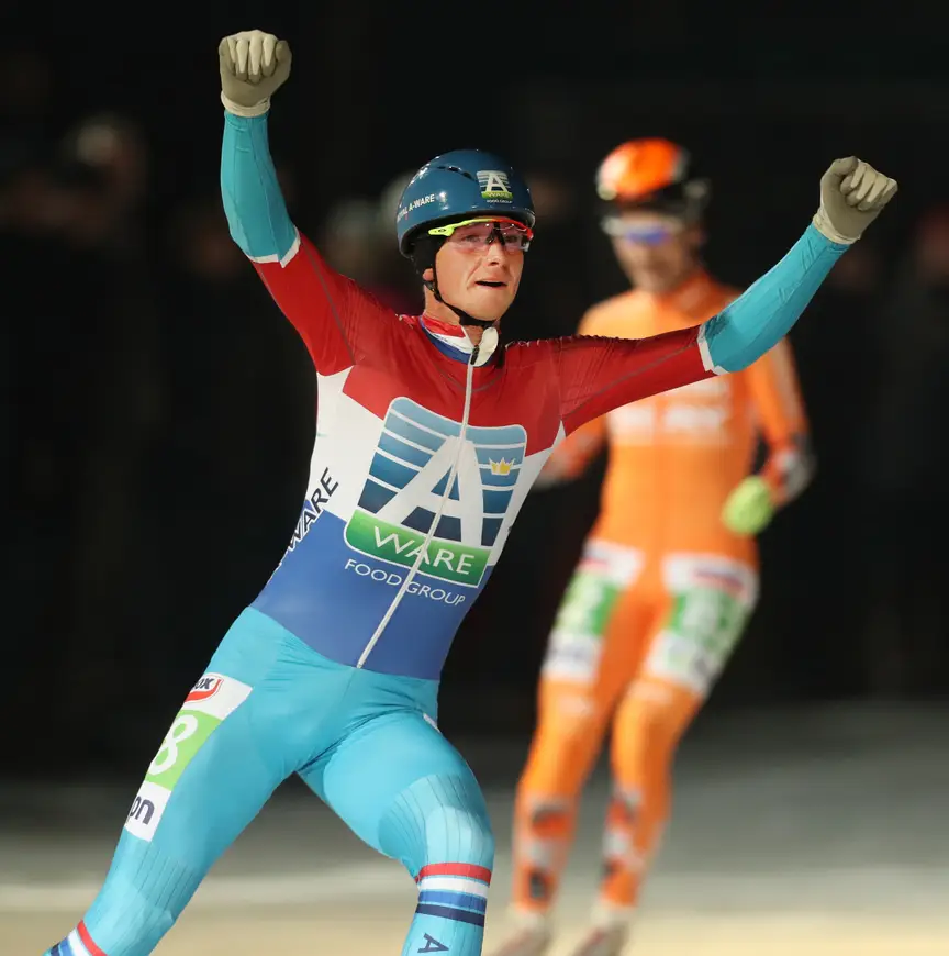 De man van Royal A-ware kijkt terug op een mooi seizoen, dat hem al met al toch vier zeges opleverde: een cupwedstrijd, twee natuurijswedstrijden en uiteraard het NK op kunstijs. ’’Vorig jaar was natuurlijk moeilijk te overtreffen, dat wist ik al. Maar nu op het einde ben ik nog aardig in de buurt gekomen. En het NK was natuurlijk super. Verder heb ik op de langebaan zeker stappen gemaakt.’’
