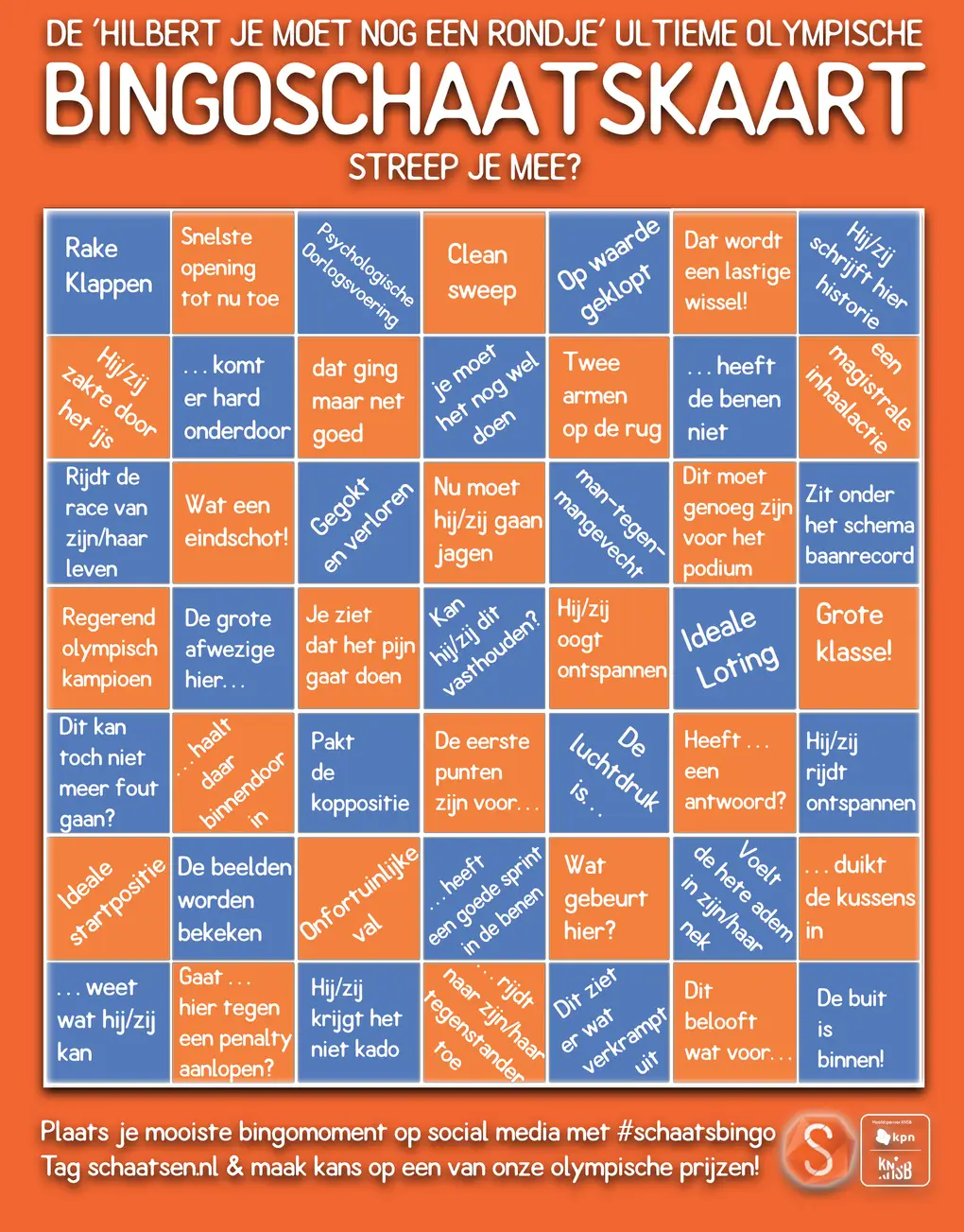 Zodra je de kreten voorbij hoort komen tijdens de langebaan en shorttrackwedstrijden streep je ze weg in de bingokaart. Plaats je mooiste bingomoment op social media met #schaatsbingo, tag schaatsen.nl en maak kans op een van onze olympische prijzen!