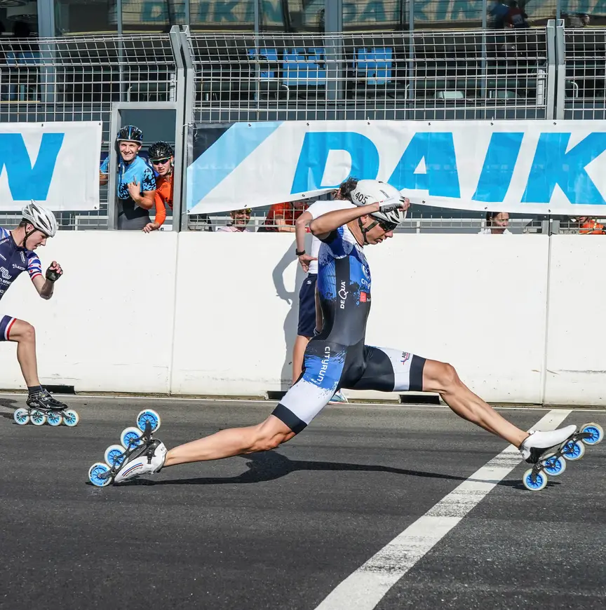 Rémon Kwant (RK): “Ik denk dat het goed voor de sport is dat je het skeeleren naar de mensen toe brengt. Dat is iets waaraan het regelmatig ontbreekt wanneer we het over een NK hebben. Dan zit je op een afgelegen plek zonder publiek – met uitzondering van ouders en wat vrienden – maar nu zorg je ervoor dat er meer volk op de been zal zijn, ook al kunnen dat voorbijgangers zijn. Het is wel een prima gelegenheid om via een wedstrijd van simpele opzet, wat de 100 meter is, mensen kennis te laten maken met inlineskaten. Ik vergelijk het met de 100 meter sprint in de atletiek, wat ik verder nauwelijks volg, maar dat onderdeel is kort, snel en spectaculair. Zo is het zondag ook. Wanneer je als leek een afval- of een puntenkoers probeert te volgen, wordt het al gauw te ingewikkeld.”