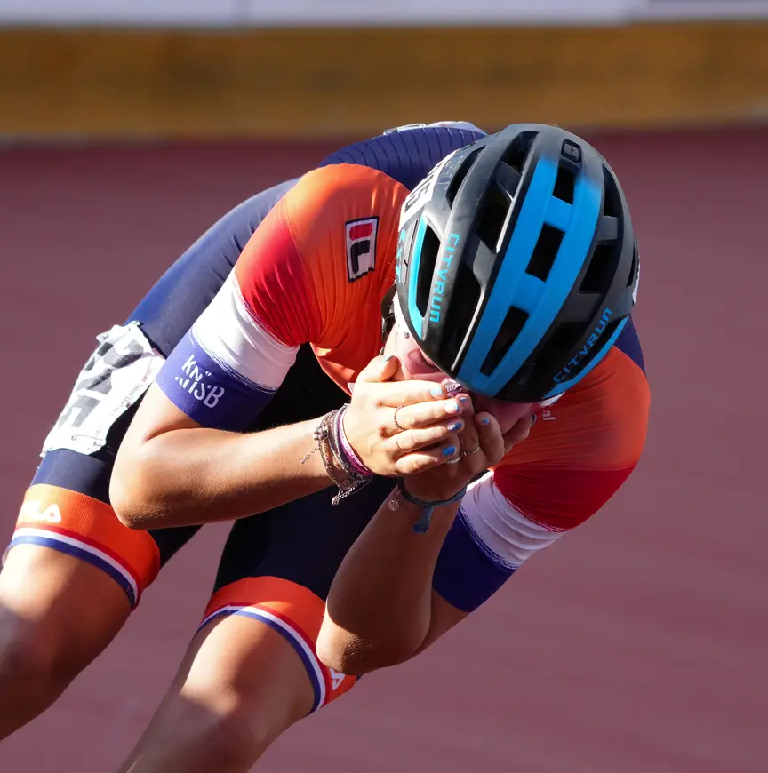 Dan Angel Daleman, de jongste klant (Junioren-B) van Oranje in L’Aquila. Ze laat zich wat overdonderen bij het vertrek, revancheert zich buitengewoon via een knappe inhaalmanoeuvre die haar op plek twee brengt. Kat in ’t bakkie, denk je, met nog een bocht en het rechte eind naar de streep te rijden. Ze snijdt ’m ruim aan, om goed uit te komen voor de sprint. Onmiddellijk duiken de anderen als wolvinnen onderdoor. Geklopt door een ‘juniorenfout’, zoals bondscoach Frank Fiers het zal omschrijven. Ze grijpt naar d'r hoofd van teleurstelling bij de finishpassage. “Ik wist niet wat ik moest doen, ik wist het echt niet. De Portugese voor me stond plotseling stil, daar schrok ik ook van. Had ik maar naar papa geluisterd”, zegt ze tegen haar moeder. “Die zei dat ik kneiterhard moest doortrekken. Daar heb ik nu niets meer aan. Dit is zó balen.”