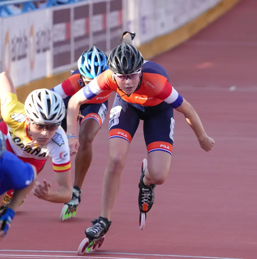 Junior-A Lataesha Narain staat bekend als een explosief dametje. Rap in de benen, vliegensvlug op weg zodra ze de startbiep hoort. Maar daar is in de halve finale niets van te zien. De concurrentie ligt meteen onbereikbaar ver voor. Ze rijdt als vierde en laatste de eerste bocht in. “Het ging niet zo lekker”, reageert ze naderhand schuchter. “Ik werd een beetje gehinderd door de Italiaanse (Ilaria Carrer, red.). Zij zette haar voet voor de mijne waardoor ik nergens heen kon, en toen Marieke (de Vries, de andere Nederlandse in de rit, red.) hetzelfde deed bij mijn andere skeeler, was ik volledig geblokkeerd. Het zou best kunnen dat de Italiaanse dat van tevoren had bedacht als truc. Vervelend.”
