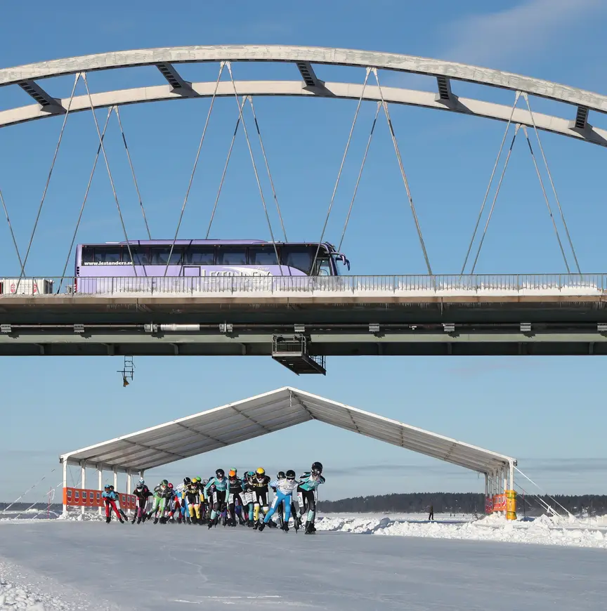 Op de uitlopers van de Botnische Golf starten Elma de Vries en Erik Jan Kooiman in het groene leiderspak van de KPN Grand Prix.