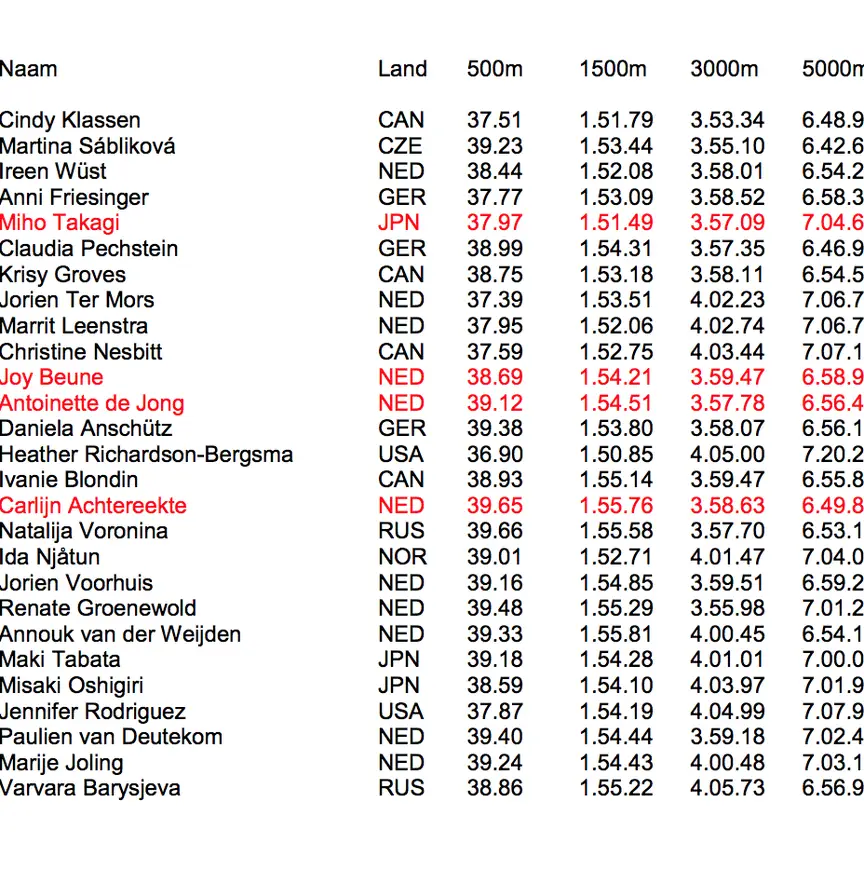 Bij de dames wordt de wereldranglijst aangevoerd door Cindy Klassen. Martina Sablikova en Ireen Wüst maken de top drie compleet. In totaal staan er tien Nederlandse vrouwen in de top 25. Naast Wüst, Beune en Achtereekte en De Jong zijn dit Jorien ter Mors, Marrit Leenstra, Jorien Voorhuis, Renate Groenewold, Annouk van der Weijden en Paulien van Deutekom (†).