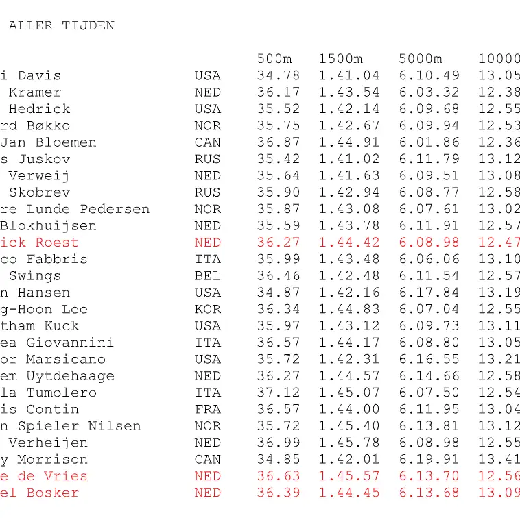 Patrick Roest reed in Heerenveen naar drie nieuwe persoonlijk records, op de 1500, 5000 en 10.000 meter. Daarmee steeg hij maar liefst 24 plekken op de ranglijst die over vier afstanden op de langebaan wordt bijgehouden. Hij stond voorafgaand aan het toernooi op plaats 35 en bivakkeert nu op een mooie elfde plaats.