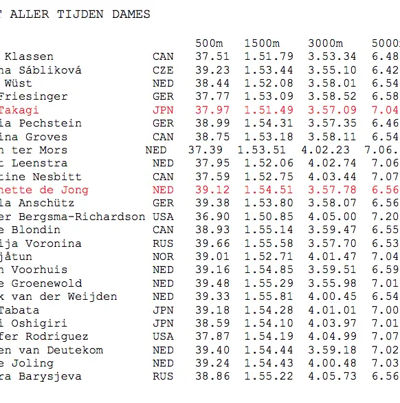 Bij de dames wordt de wereldranglijst aangevoerd door Cindy Klassen. Martina Sablikova en Ireen Wüst maken de top drie compleet. In totaal staan er negen Nederlandse vrouwen in de top 25. Naast Wüst en De Jong zijn dit Jorien ter Mors, Marrit Leenstra, Jorien Voorhuis, Renate Groenewold, Annouk van der Weijden, Paulien van Deutekom en Marije Joling.