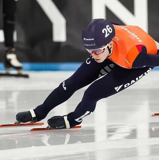 Op zijn persoonlijke Instagram-pagina blijkt dat de jonge schaatser snel over de ergste klap heen is van de blessure die hem voorlopig aan de kant zal houden. ‘New record for shortest training camp’, meldt hij op een foto waarop zijn gespalkte enkel is te zien. “De eerste trainingssessie”, vertelt de 21-jarige Utrechter, “en ik was meteen klaar. We reden een paar rustige relays om erin te komen. Het schaatsten ging vrij goed, totdat ik tijdens de tweede relay voor de tweede keer de baan in wilde rijden. Ik zette met rechts in, wat een gek gevoel gaf en onmiddellijk erna deed ik dat opnieuw. Op hetzelfde moment schoot ik helemaal weg, schoof onderuit en nam twee andere jongens mee in mijn val. Mijn enkel deed pijn, maar ik dacht: daar heb ik vaker last van, wanneer ik een schuiver maak. Het voelde in elk geval niet als gebroken.”