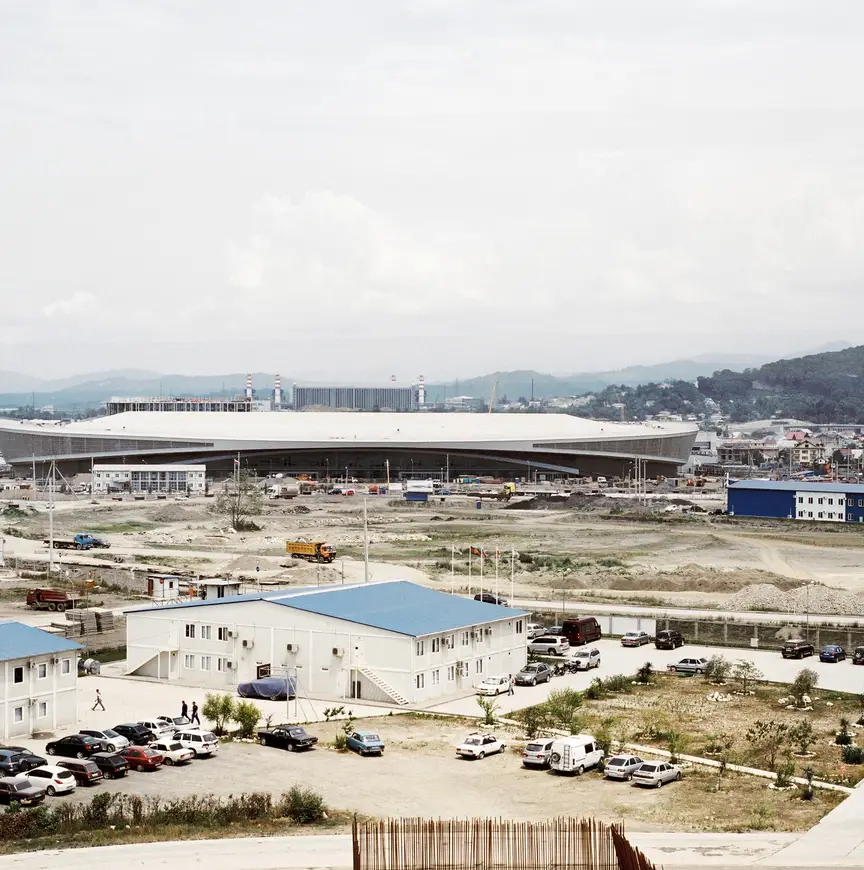 Het ijsstadion in aanbouw. De bovenste foto is gemaakt in maart 2009, de onderste in juni 2012 |Fpto: Rob Hornstra / The Sochi Project