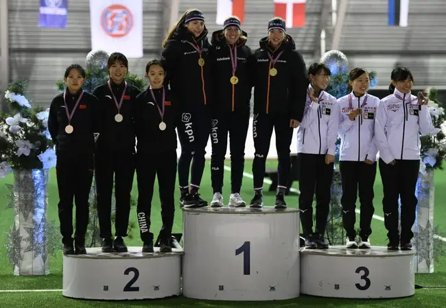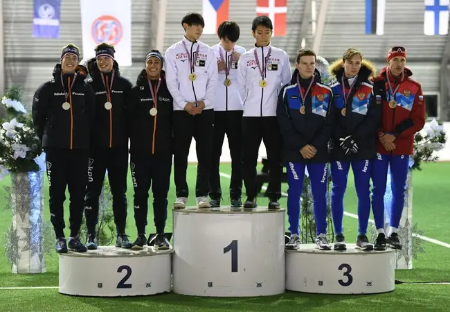 Het laatste onderdeel van de eerste dag in Bjugn leverde ook medailles op voor de Nederlandse junioren. De vrouwen, met Femke Kok, Maud Lugters en Marrit Fledderus, grepen het goud op overtuigende wijze. De Nederlandse dames waren maar liefst drie seconden sneller dan de nummer twee, Rusland. De mannen, met Sebas Diniz, Jur Veenje en Jarle Gerrits op het ijs, pakten de zilveren plak. Japan pakte de winst.