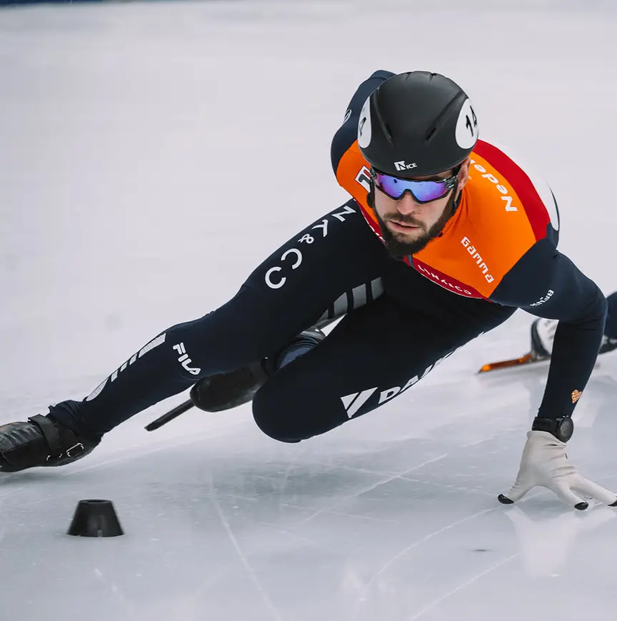 “We deden nog een paar accelletjes (Steigerungen, red.)”, zo maakt hij een korte reconstructie van hoe het is misgegaan. “Ik reed op kop voor ‘Vlad’ (Vladislav Bykanov, een Oekraïnse Israëliër die al jaren meetraint met de Nederlanders, red.) en de Belg Stijn Desmet. Het ging best lekker, maar ook heel snel. Alles trouwens, wat erna allemaal gebeurde. Ik stond op rechts en plotseling hapte mijn punt in het ijs. BAM!, we gingen met hoge snelheid onderuit. Terwijl ik naar de boarding vloog kreeg ik een flashback van 2011, toen ik al een keer mijn enkel heb gebroken. Het voelde ook nu echt, écht niet goed. Ik jankte van de pijn, maar net zo goed omdat ik het hele seizoen voorbij zag komen. Ik moet nog een NK rijden, een EK, een WK, en misschien wel de Spelen, dacht ik. Dat is niet leuk, kan ik je vertellen….”