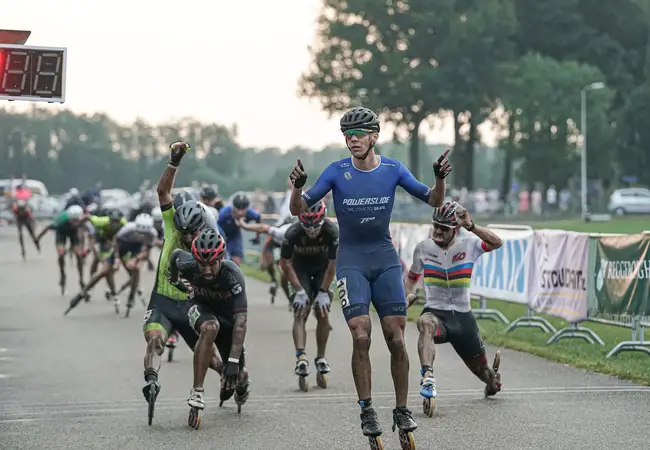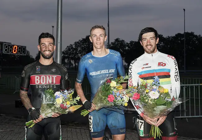 Of hij die net als vorige week aan zijn vriendin geeft? "Ha, ze appte me vanochtend al dat de bloemetjes van de wedstrijd uit Deventer dood waren en dat het tijd was voor nieuwe. Nou, als ik vanavond thuiskom, zal ze ongetwijfeld blij zijn met deze nieuwe", grinnikt de meervoudig wereldkampioen op wieltjes. De tweede plek in Staphorst ging naar de Portugees Diogo Marreiros en de derde plek was voor de Fransman Beddiaf. "Het is jammer dat dit alweer m'n laatste wedstrijd van het seizoen is, maar het is niet anders. Twee uit twee is zeker niet slecht!"