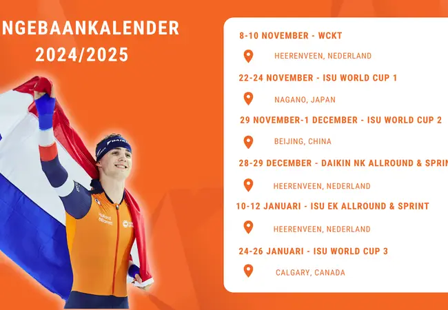 Na alle voorbereidingen in de zomer begint het wedstrijdseizoen voor de topschaatsers op vrijdag 8 november met het World Cup Kwalificatietoernooi. In dat weekend zijn tickets te verdienen voor de eerste World Cups. De beste rijders plaatsen zich voor het treffen in Japan en China. Tussen kerst en oud en nieuw keren de Nederlanders terug naar Thialf voor het Daikin NK Allround & Sprint. Wie bovenaan de klassementen eindigen, mogen twee weken later deelnemen aan het EK Allround & Sprint. Hopelijk kleurt dan het hele stadion oranje, want het toernooi wordt in Heerenveen georganiseerd.