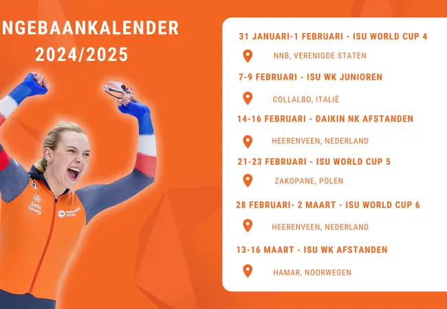 De Nederlandse fans mogen zich verheugen op het weekend van 28 februari tot en met 2 maart, als het wereldbekerseizoen wordt afgesloten in Thialf. Half maart volgt dan nog het belangrijkste toernooi van de winter: het WK Afstanden in Hamar.