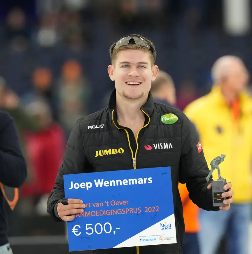 Een miniatuurversie van het bronzen beeld ging naar Joep Wennemars, die door de KNSB werd uitgeroepen tot Talent van het Jaar. Wennemars, die ook uitkomt voor team Jumbo-Visma, won vorig seizoen drie gouden en twee zilveren medailles bij de WK Junioren in Innsbruck. Hij werd daar wereldkampioen op de 500 meter en 1000 meter en greep er ook de allroundtitel, die voor het eerst sinds 2017 weer naar een Nederlandse man ging. Bij het WK Junioren won Wennemars tevens zilver op de 1500 meter en de ploegachtervolging. Zijn puike prestaties leverden hem niet alleen een bronzen beeldje op, maar ook een cheque van 500 euro: de Egbert van ’t Oever Aanmoedigingsprijs, vernoemd naar de voormalige bondscoach die in 2001 overleed.