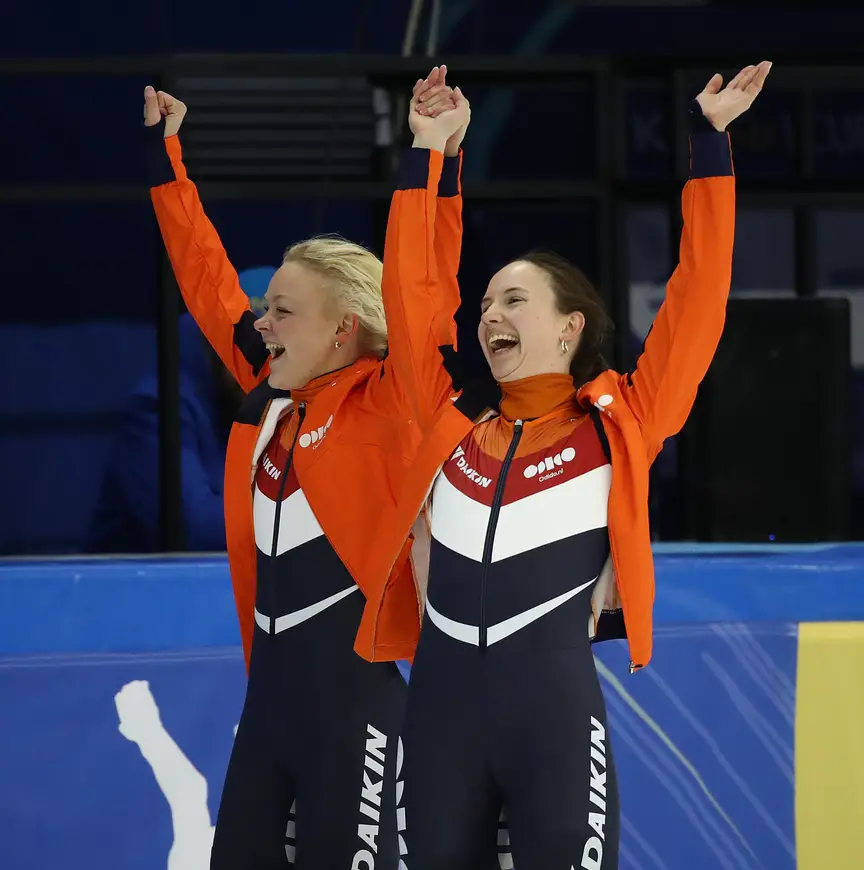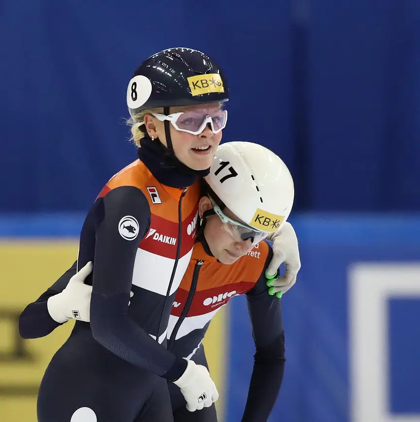 Te gek. Surrealistisch, bijna. Geen armen de lucht in van vreugde, wel van vertwijfeling. Want wie had er nou gewonnen in die adembenemende rush naar de streep op het ijs van de Mokdong Arena in Seoul, waar in maart al zoveel medailles in de wacht waren gesleept? Selma Poutsma hapte, hangend over het veiligheidskussen, naar lucht, Xandra Velzeboer bleef gebiologeerd naar het scorebord kijken, terwijl ze haar handen voor zich samenvouwde, alsof ze even snel een schietgebedje deed voor een goede afloop. Een paar tellen later brak de lach door op haar gezicht, op dat van Selma, bij iedereen die achter de boarding in het oranje gehuld vol spanning had staan meeleven in de 43 seconden durende thriller. Het scorebord loog niet: 1. Selma Poutsma, en 1. Xandra Velzeboer. Of omgekeerd. De 500 meter was opnieuw van Nederland. Met een stukje daarachter een Chinese, Ye Wang, die als figurant in de razendsnelle eenakter brons verdiende.