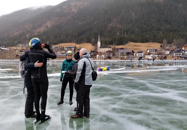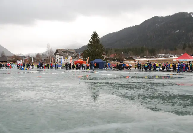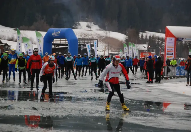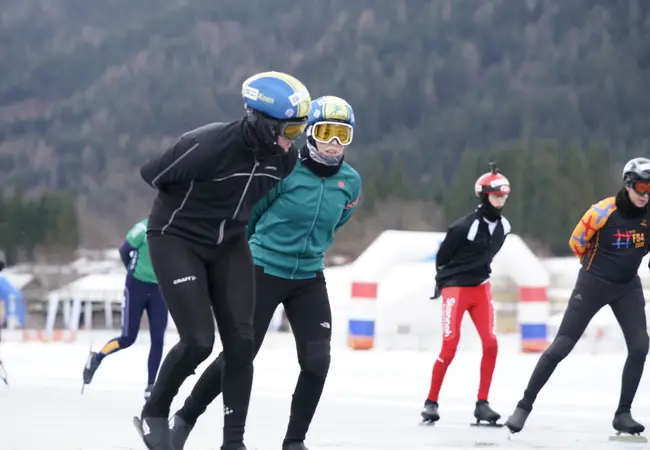 Onder de schaatsers bevinden zich ook Koen en Kimberly. De twee twintigers zijn al tien jaar bij elkaar en werden afgelopen najaar lid van de Tilburgse ijsvereniging. Ze hadden wel eens geschaatst, maar eigenlijk nog nooit echt getraind. Toch gaven ze zich meteen op voor de bijzondere trip naar de Weissensee. Ondanks een valse start (de transponder van Koen werkte niet) houden ze flink de vaart erin en rijden ze strak op schema om ruim binnen de tijd binnen te komen.
