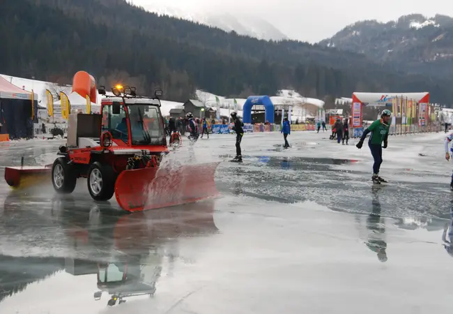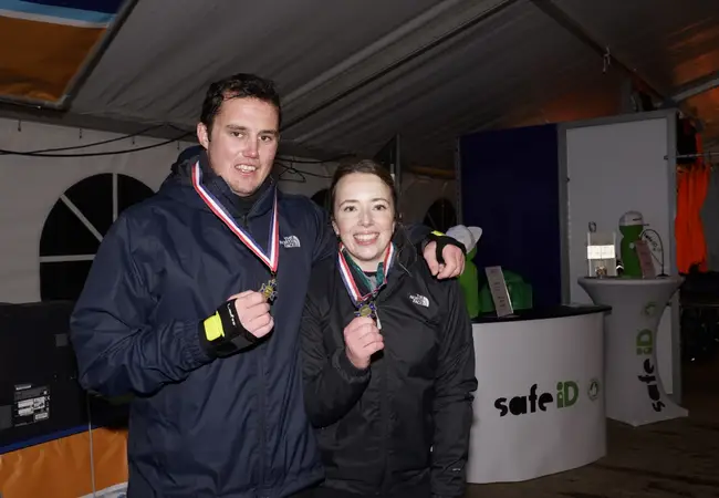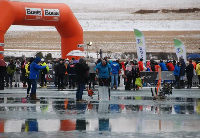 Hun ouders staan langs de kant en trotseren net als het schaatsende koppel de regen en de wind. Af en toe trekken ze hun schoenen los uit het door de dooi langzaam smeltende ijs. “Ze komen er zo weer aan hoor”, luidt het enthousiast. “Dan moeten we er natuurlijk wel staan met een drankje en een reepje.” Ook Hans is meegereisd en moedigt zijn vrouw Angelique van harte aan. Via de app van de organisatie houdt hij alles tot in detail in de gaten. Met een fles Schrobbelèr in zijn tas vangt hij ook nog eens alle deelnemers op die al klaar zijn of onderweg zijn afgehaakt. Ondanks de nodige pechgevallen, twee gebroken polsen en een rijder met een schouder uit de kom, blijft de sfeer langs de kant positief.