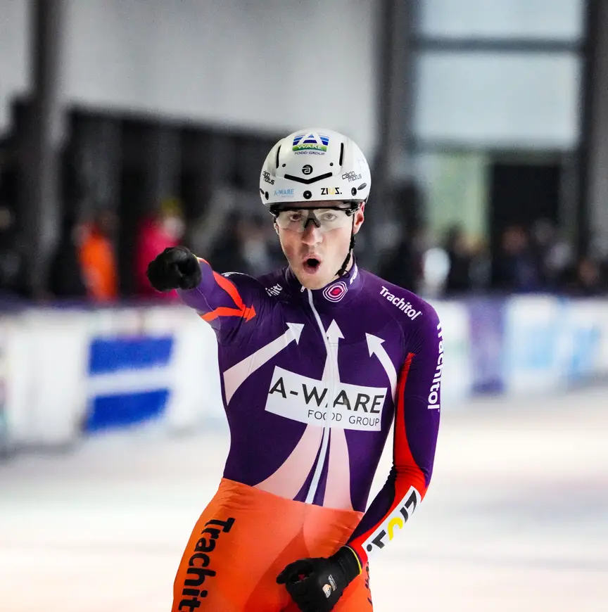 Het ziet er op het ijs van De Meent in Alkmaar aan het slot soepeler uit dan het in werkelijkheid is geweest. “Een zware race, man, dit voelde ik wel. We gingen rond, maar dat duurde relatief lang voor zo’n grote kopgroep (vijftien man, red.). Op een gegeven moment kwam ik in een modus waarin ik niets meer voelde en alleen aan winnen kon denken”, vertelt De Boer, vanzelfsprekend ook de winnaar van het algemeen klassement. “Ik heb een heel grote pijl aan het einde, een die ik slechts een keer kan afschieten. Dus moet ik heel efficiënt omspringen met mijn energie. Dat is vandaag heel goed gegaan”, constateert hij zichtbaar tevreden. Het is niet voor niets dat hij dat karakteristieke pijlenpak van Trachitol draagt.