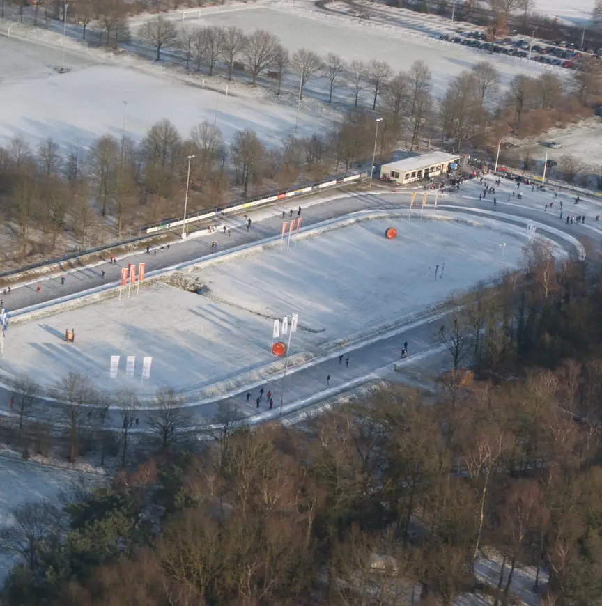 In Haaksbergen laat men water op de ovaal lopen en moet ijs aangroeien voordat overtollig water weer wegloopt. Maandagochtend werd er 0,8 centimeter ijs gemeten en men is hoopvol door de goede omstandigheden: het grootste deel van de dag bleef de temperatuur onder het vriespunt. “We zijn vol goede moed, de sfeer onder de vrijwilligers was uitstekend vanochtend op de baan”, zegt Derk Klumpers, secretaris van de natuurijsmarathonorganisatie die in Haaksbergen. “Het water op onze baan veranderde zondagavond om 19.00 uur in ijs, binnen een half uur lag de baan dicht. Een geweldig natuurkundig proces om van dichtbij te zien. We hebben een beetje sneeuw gehad, maar dat is niet ernstig. De baan is mooi schoon, belangrijk omdat de ene kant grenst aan de bosrand. Verder hebben we de schermen in gereedheid waarmee we de andere kant van de baan in de schaduw kunnen zetten, belangrijk zodat we door de zon geen ijs kwijtraken. Het ligt er fantastisch bij, het gaat vanavond vriezen en dan moeten we morgenochtend kijken hoe het ervoor staat.”