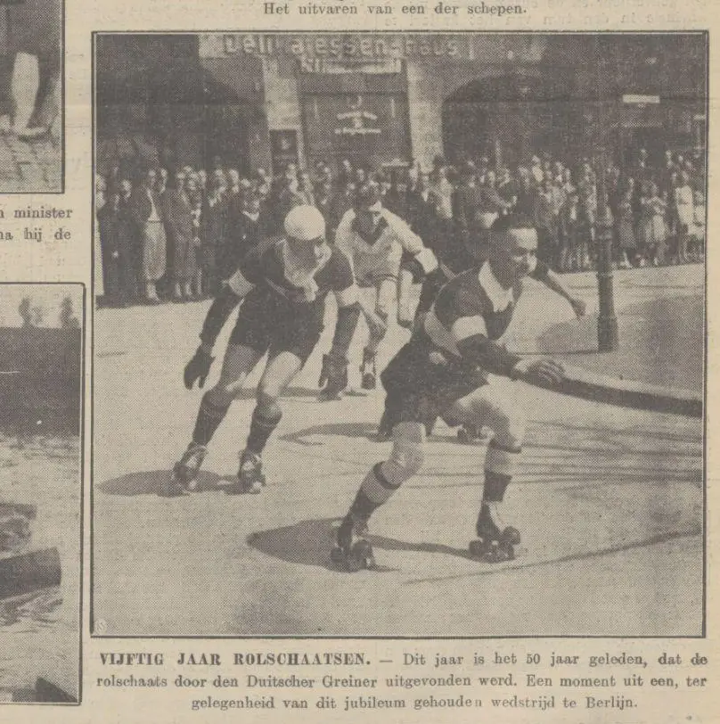 Op deze foto uit de Noordbrabantsche Courant zien we een aantal van deze rolschaatsende snelheidsduivels in actie in Berlijn, waar ter gelegenheid van het jubileum een wedstrijd werd gehouden.