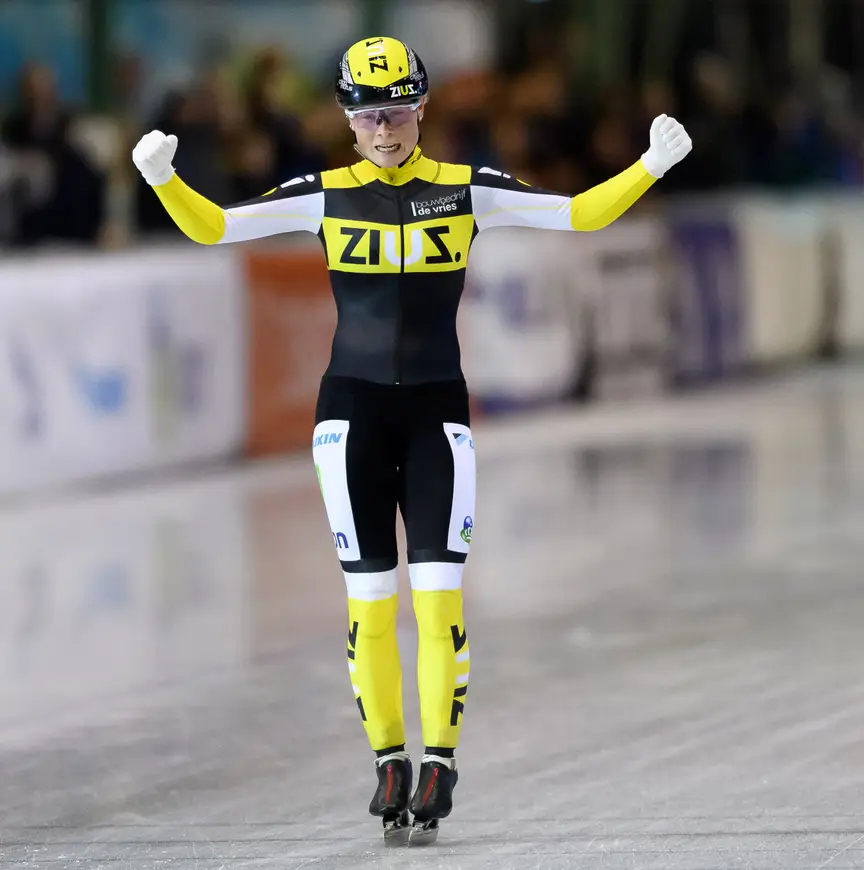 Nog voor de laatste bel sloegen Elisa Dul en Groenewoud een gaatje op het peloton. "Dat had ik eerste niet door", vertelt Groenewoud. In de slotronde toonde ze zich veruit de sterkste. "Op het grote scherm langs de baan zag ik de voorsprong dus halverwege het rechte stuk kon ik al met mijn handen omhoog. Dat is mooi aankomen." De tweede plek was voor Imke Vormeer en nummer drie werd Emma Engbers. Het tablettenpak zit om de schouders van Beau Wagemaker, die beide tussensprints won.