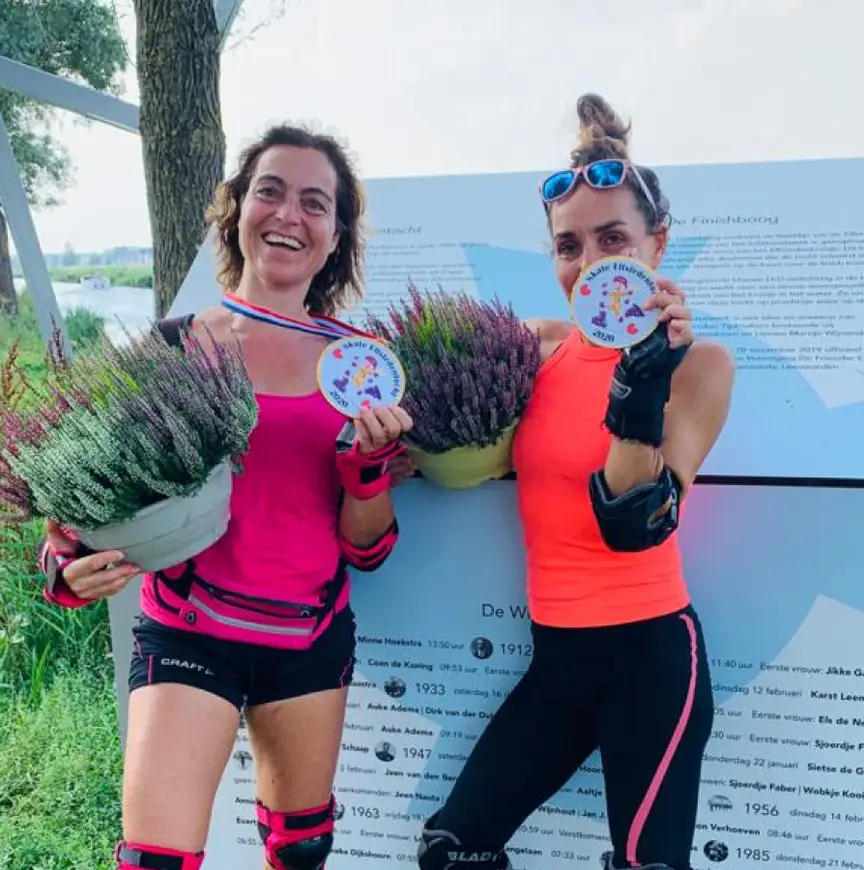 “Meestal skaten we vanuit Baarn ergens naar toe. Bijvoorbeeld naar Apeldoorn, Zwolle of Zandvoort of andere plaatsen met een station en dan pakken we de trein terug. Ook hebben we de 11 stedentocht in 3 dagen geskate met een finish op de Bonkevaart. Maar ik denk dat het ook heel leuk is om met de trein ergens naartoe te gaan en daar met de app een route te gaan rijden die iemand daar heeft uitgezet . We zijn wel van de lange routes. Voor minder dan 60 kilometer gaan we tegenwoordig niet meer samen op pad. Vaak vertrekken we ‘s ochtends vroeg op de skates en dan pakken we tussendoor verschillende terrasjes. Als we aangekomen zijn op de bestemming eten we wat en gaan we met de trein terug. Daarvoor nemen we altijd schoenen mee. Als je na zo’n dagje skaten terugkomt heb je het gevoel dat je op vakantie bent geweest en je ziet zo heel wat van Nederland.”