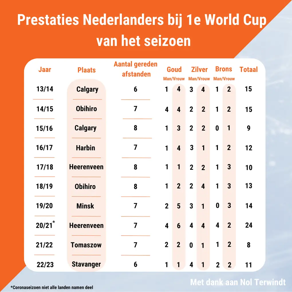 Een blik op het verleden leert dat Nederland de afgelopen tien jaar bij de eerste World Cup van het seizoen minimaal één gouden medaille heeft gepakt bij de mannen en één bij de vrouwen. De minimale medailleoogst was in die periode bij een openingswereldbeker acht plakken. Het seizoen in de ‘bubbel’ – wegens coronamaatregelen ontbraken veel landen – springt er qua resultaten bovenuit met tienmaal goud. Het lijkt een illusie om dat aantal te evenaren. 2021/2022 valt in negatieve zin op. Alleen Irene Schouten en de mannen van de 1000 meter scoorden naar behoren. De Zweed Nils van der Pool, de Japanse Miho Takagi en de Amerikaanse Erin Jackson en Brittany Bowe zorgden enkele maanden voor de Olympische Spelen voor paniek in het Nederlandse kamp. Zeker toen ook de tweede World Cup tegenviel. Maar de hoofdprijzen werden pas in februari verdeeld…