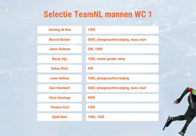 Het World Cup Kwalificatietoernooi (WCKT) was een slagveld. Bekende namen die zich niet (op hun geliefde afstanden) plaatsten en verrassingen die kwamen bovendrijven. Sebas Diniz (500 meter), Jesse Speijers (5000 meter), Tim Prins en Jenning de Boo (beiden 1000 meter) zullen in Japan hun eerste slagen maken in het internationale seniorencircuit. Een mooie kans voor de jonge schaatsers om te leren van de besten op hun afstanden. Komen ze definitief bovendrijven of hebben ze last van plankenkoorts?