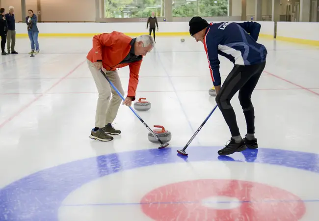 Sinds een week of drie ligt op dat beton een fijne ijsvloer. De Leidse schaatsers gaan er in alle opzichten op vooruit, dat zie je in één oogopslag, al zal het misschien even duren voor het oude huiskamergevoel van de Vondellaan terug is. Hier ligt allereerst een ijsvloer van 30 bij 60 meter, geschikt voor shorttrack, kunstrijden en ijshockey. Deze piste is exclusief voor de 25 verenigingen die in Leiden actief zijn. Daarnaast ligt nu ook een funbaan van 45 bij 20 meter, bestemd voor beginnende schaatsers én curling. Arts: “Het biedt ook commerciële mogelijkheden voor het houden van clinics, feestjes en andere evenementen.”