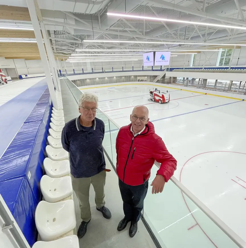 Nog een fraaie noviteit: de oude Zamboni is vervangen door twee ijsdweilmachines van leverancier WM. Deze Mammoets rijden op accu’s en zijn voorzien van (gps-)techniek die, zoals Tesla’s, straks op de automatische piloot het ijs kunnen prepareren. Omdat de ijshal drie maanden later werd opgeleverd dan gepland – niet alles is hosanna in dit verhaal – is de afstelling van de machines nog niet voltooid. “Maar straks rijden ze als eerste van Nederland onbemand over de baan en maken ijs van de beste kwaliteit”, zegt Arts.