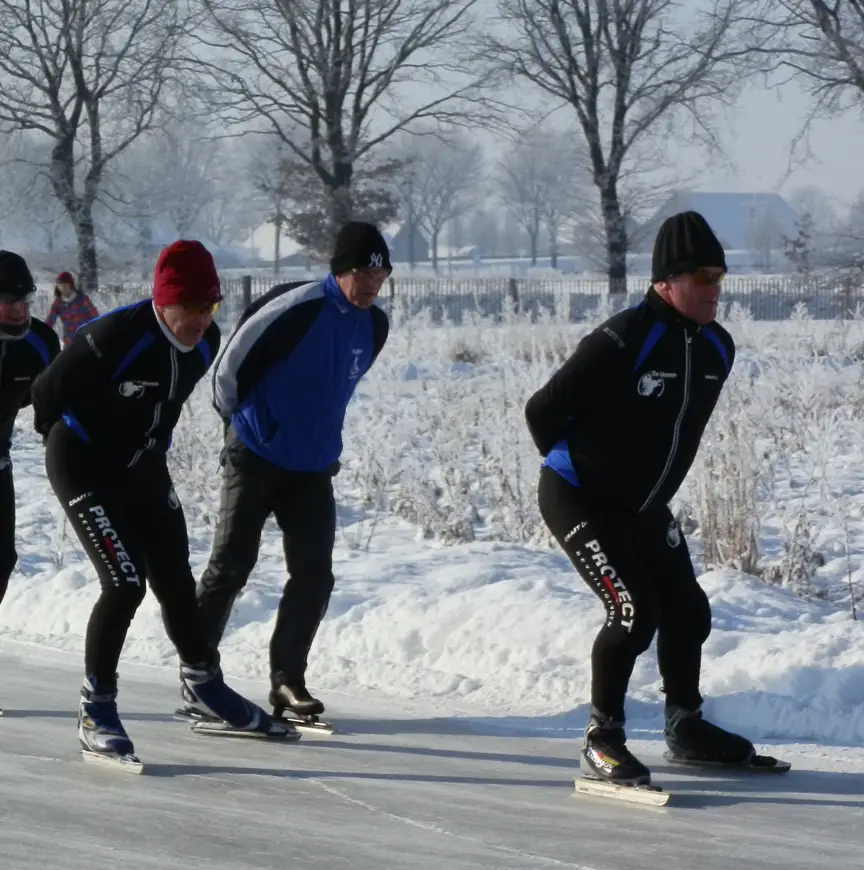 "Maar sinds een jaar hebben we hier in de gemeente ook een natuurijsbaan van 400 meter en dat is helemaal ideaal. Want het ven waar wij rijden – het Brandven – ligt in de bossen, op zo’n twee kilometer buiten het dorp. Daar sturen ouders hun jonge kinderen liever niet alleen heen. De nieuwe baan daarentegen ligt tegen een woonwijk aan en dat trekt heel veel kinderen. Omdat er op dat terrein maar 25 tot 30 centimeter water staat dat hoeft te bevriezen, is het ook snel geschikt om op te schaatsen."