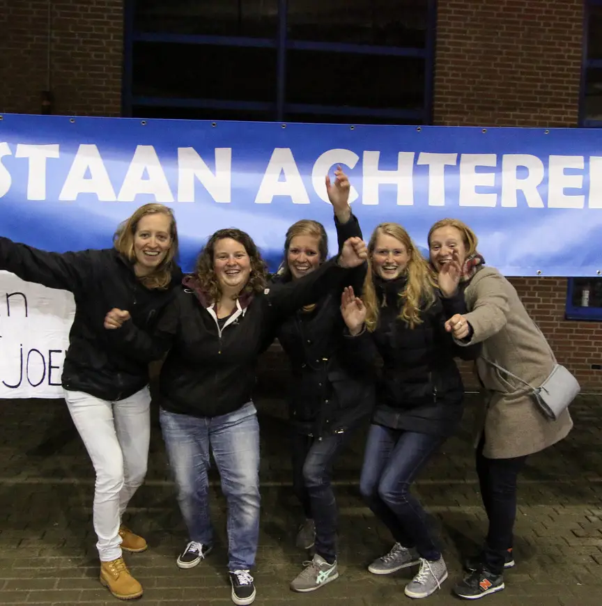 Aan het spandoek dat ze speciaal voor hun vriendin lieten maken zal het in ieder geval niet liggen. De dames bevestigen aan het professionele doek ook nog snel een kleiner, zelfgeschreven wit spandoekje. 'En Sjoerd', luidt de toevoeging. "Ja, Sjoerd de Vries wilde ook graag een spandoek, dus dat hebben we maar gedaan", lachen ze.